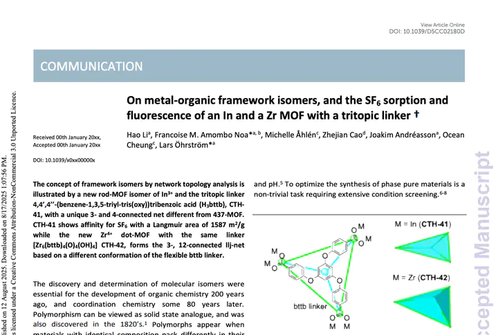 New paper out in Chemical Communications: On metal-organic framework isomers, and the SF6 sorption and fluorescence of an In and a Zr MOF with a tritopic linker